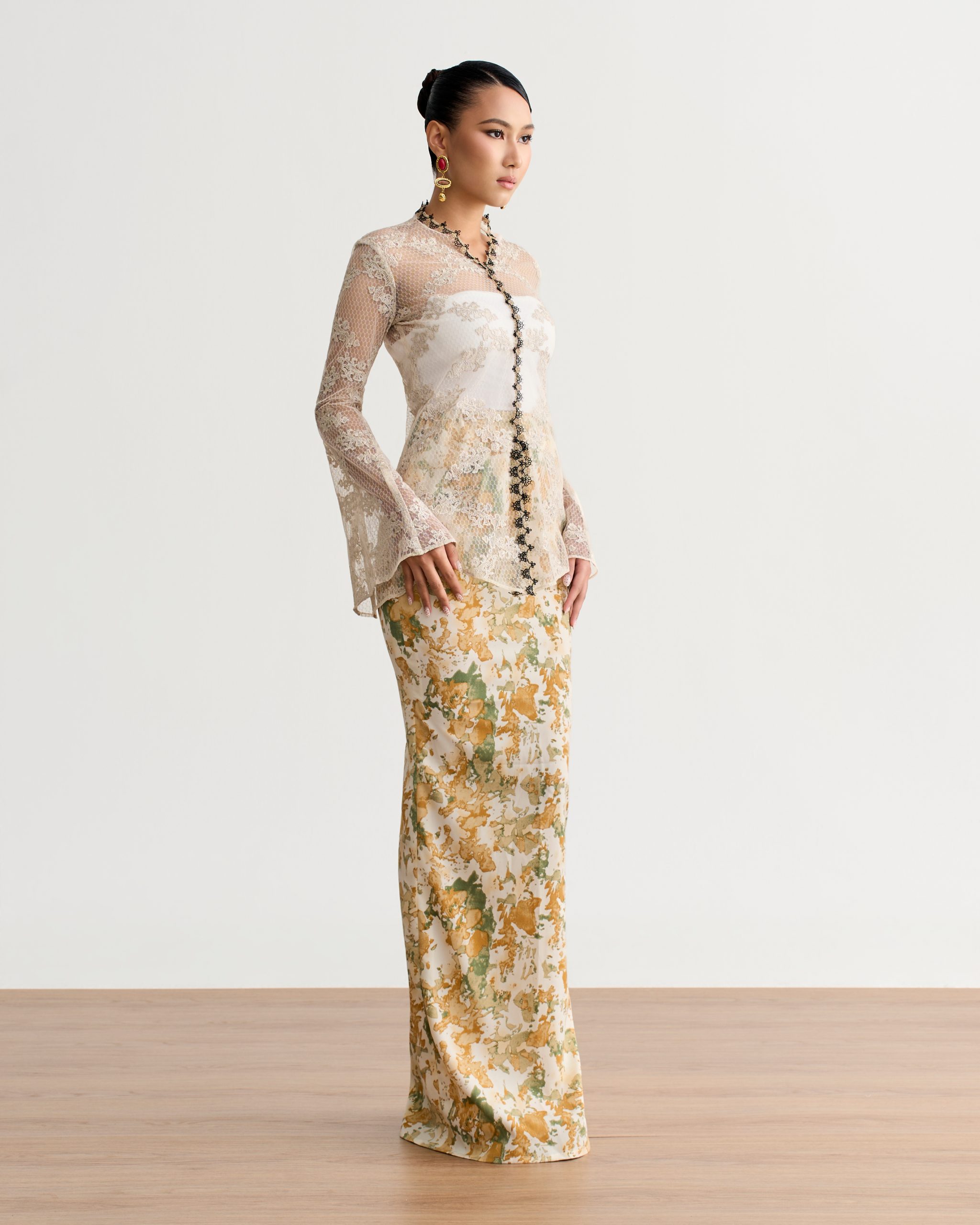 The Amaya Kurung Kebaya is a graceful blend of modern refinement and timeless tradition. Crafted with delicate gold lace, the kebaya features elegant lace detailing that enhances its classic charm while maintaining a contemporary appeal. The classic fan sleeves add a soft, feminine silhouette, offering both comfort and visual elegance.