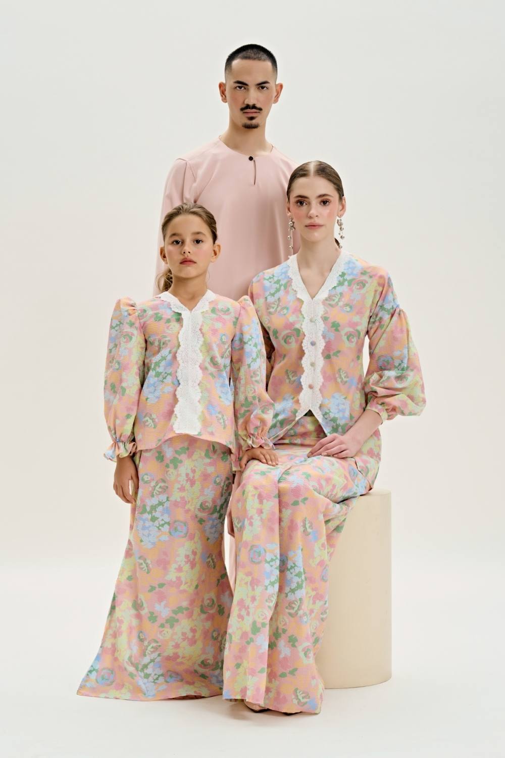 Clara is a modern rendition of mini kebaya with lacey V-neck detail and puffy sleeves. Clara also comes in kids size.