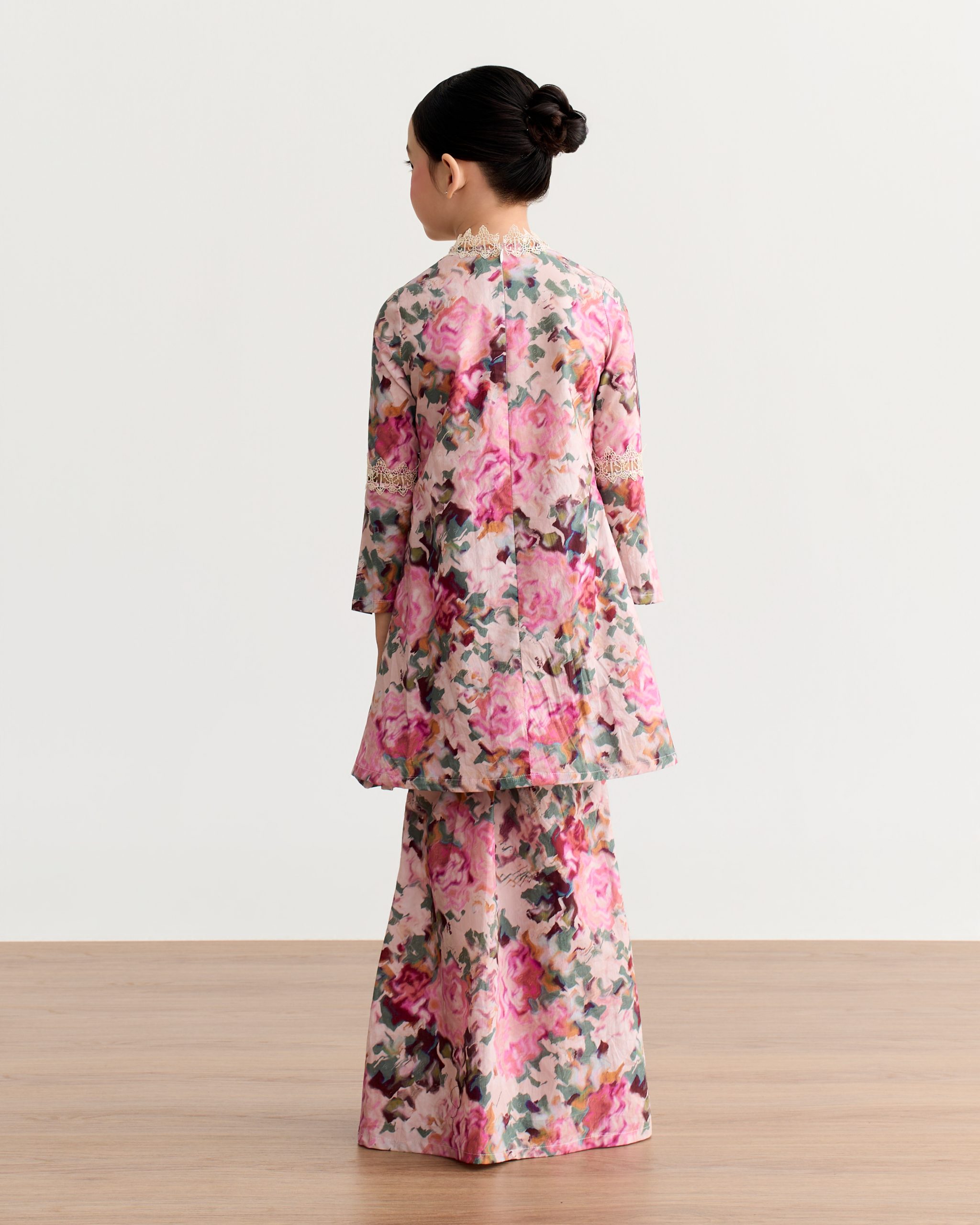 The Eleena Kurung Pahang Kids is a charming blend of elegance and playful detailing. Featuring side fan pleats and a delicate lace-trimmed collar, this kurung adds a sweet and refined touch to any little one’s wardrobe. The pleated sleeves with lace accents create soft, graceful movement, while the godet-style skirt flows beautifully with every step.