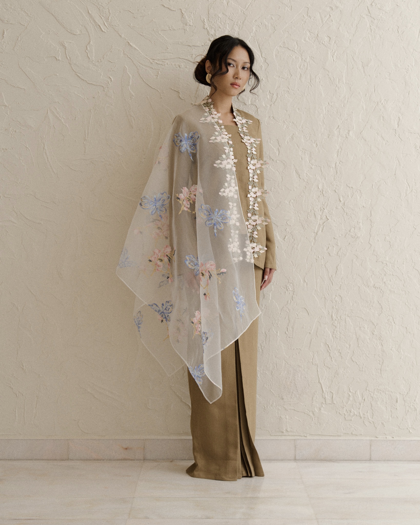The skirt is designed with front pleats, creating a polished and elegant flow. Completing the look is an embroidered organza shawl, perfectly coordinated to enhance the overall ensemble.