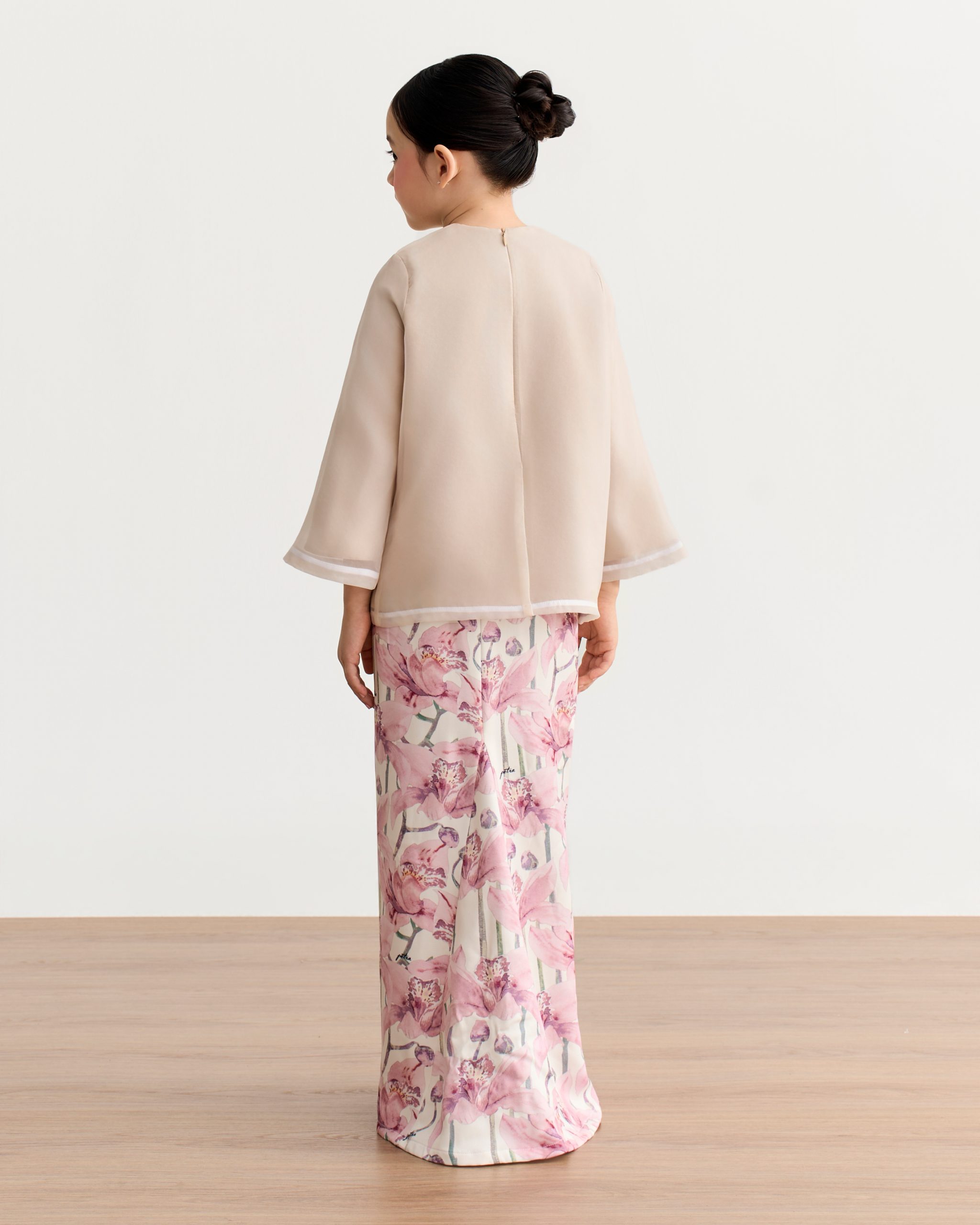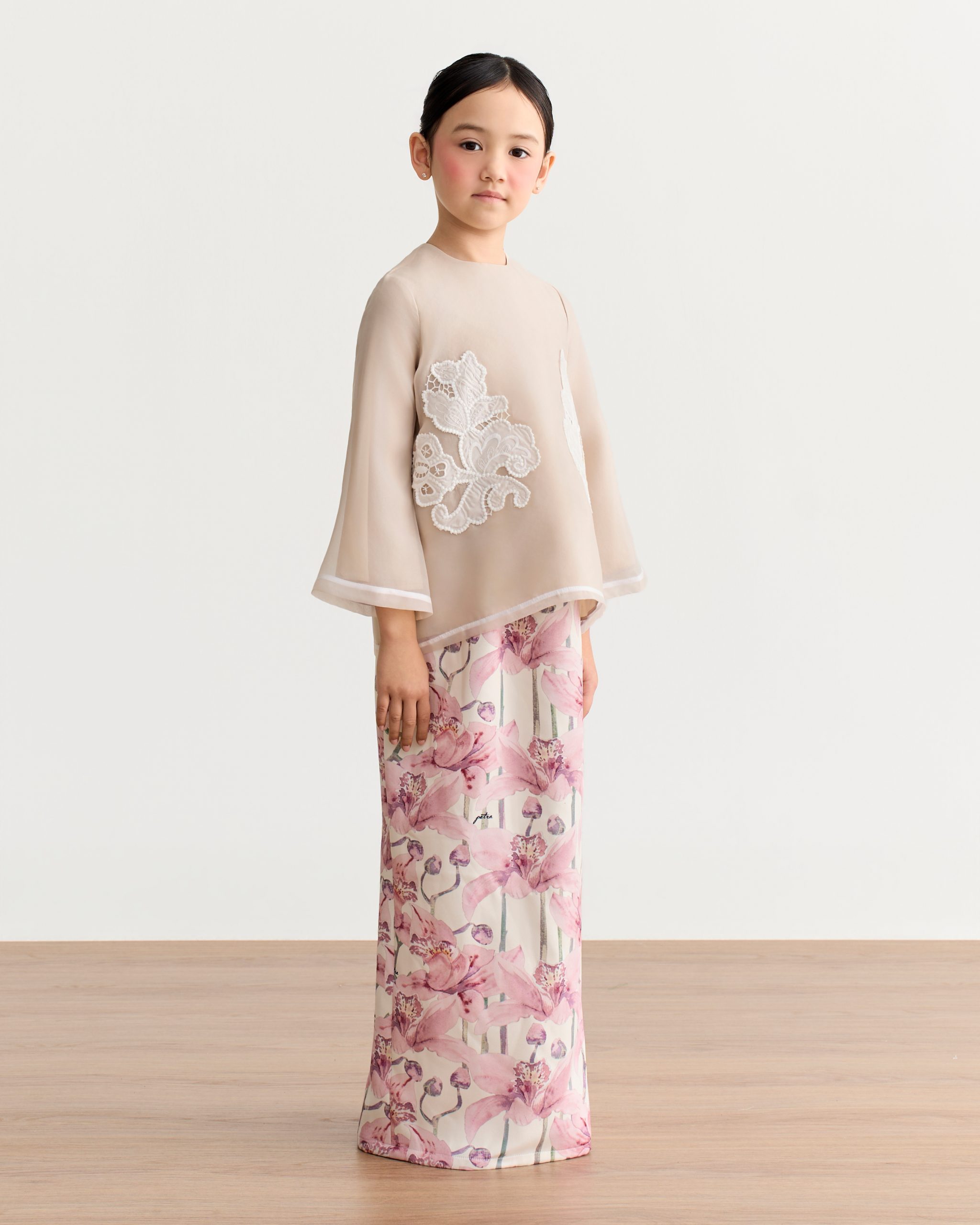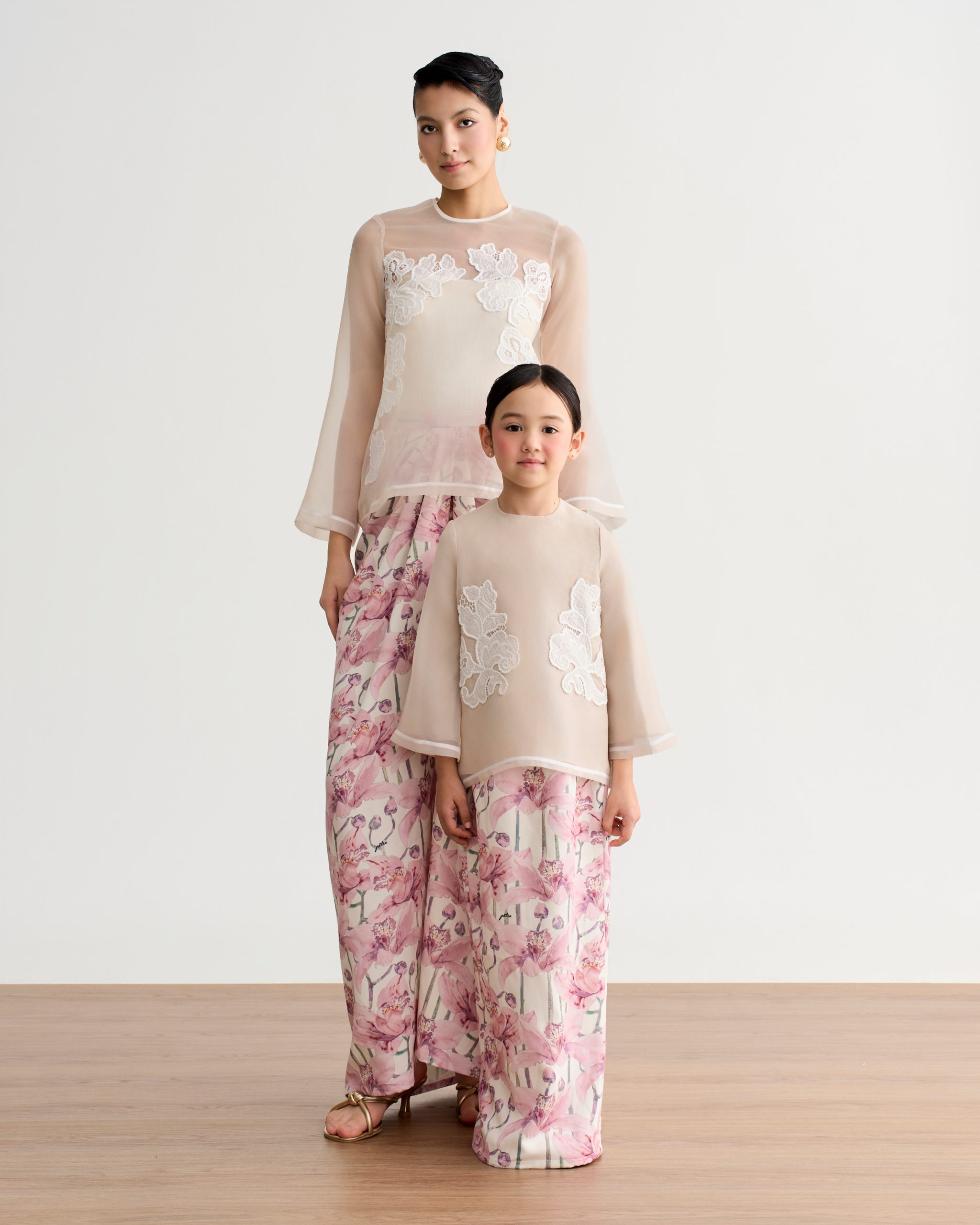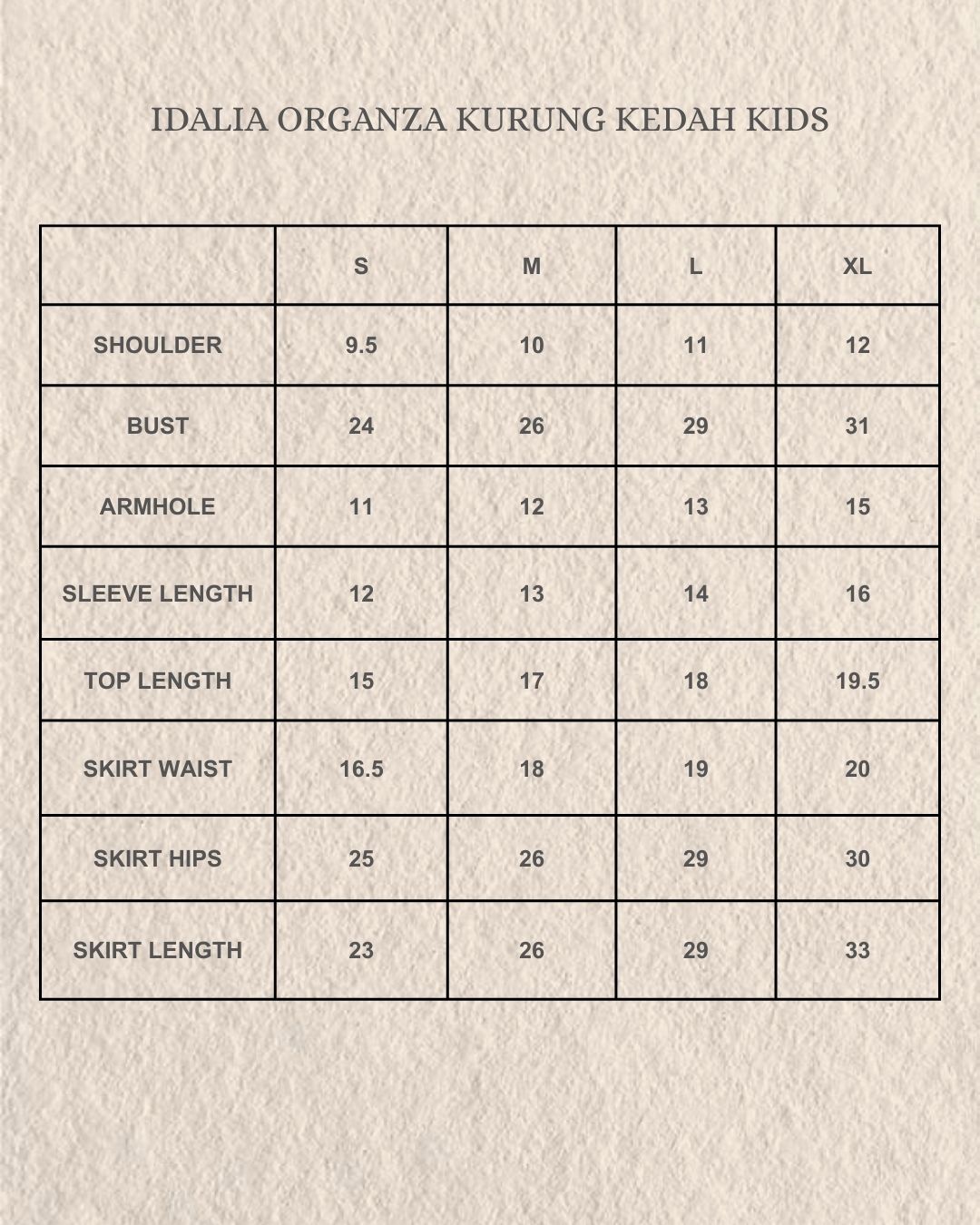 The Idalia Organza Kurung Kedah Kids is a sweet and elegant choice for little ones. Featuring delicate front lace detailing and a lined top for comfort, this kurung adds a charming touch to festive and special occasion outfits. The godet-style skirt flows gracefully, complemented by a full waistband for ease of wear.