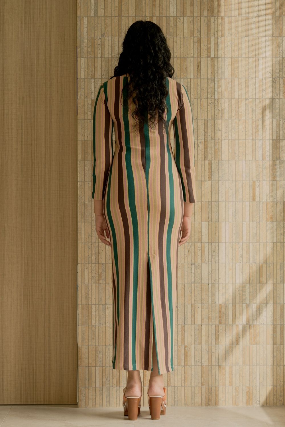 A chic stretchy wrap dress crafted from cozy knitwear, featuring a muted neutral striped pattern for a trendy, sophisticated look. Designed to flatter with its wrap silhouette, this versatile piece combines comfort and elegance effortlessly.