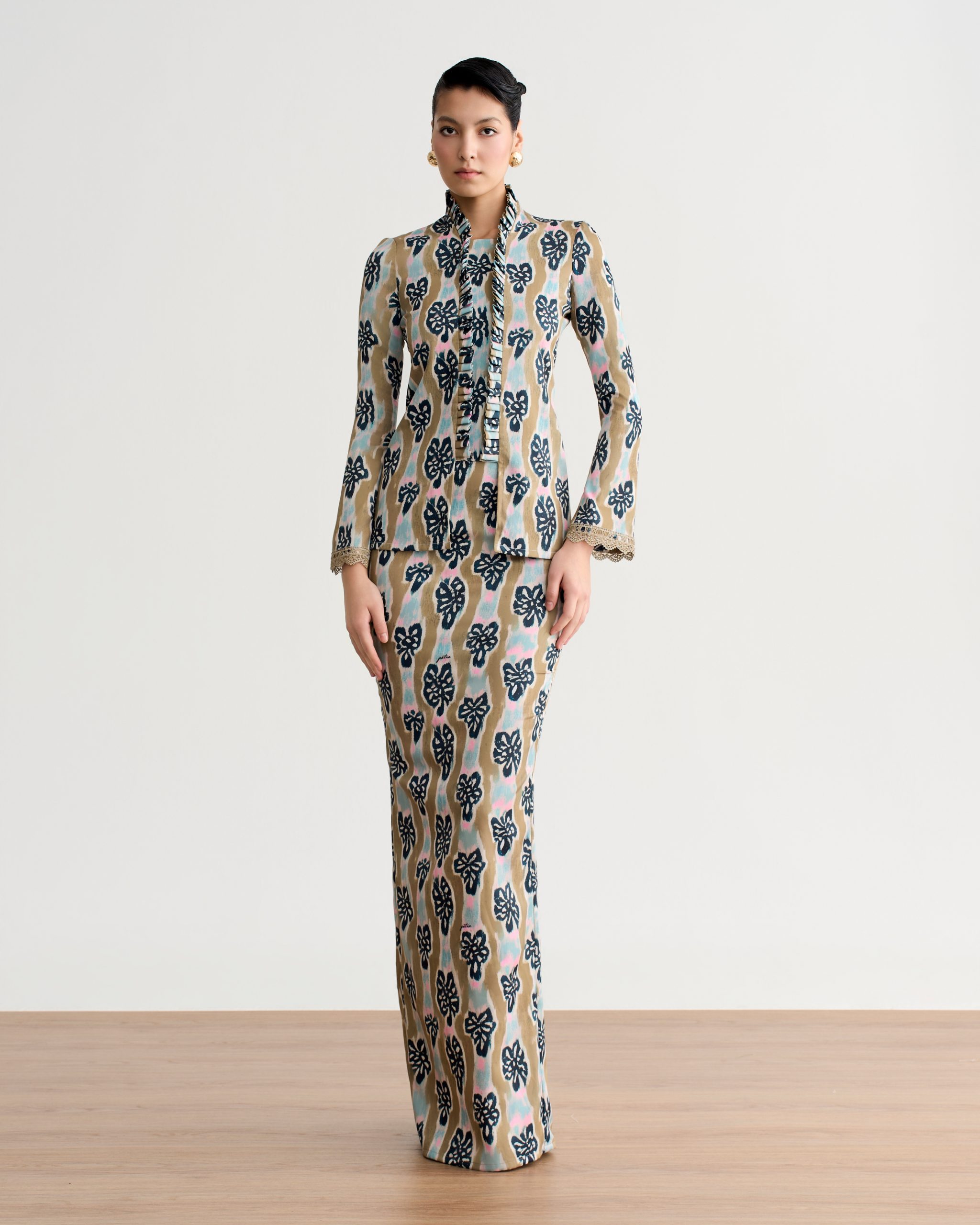 The Taneea Modern Kebaya is a refined statement piece that blends contemporary design with feminine elegance. Designed with delicate ruffles along the neckline, this slim-cut kebaya highlights a graceful and flattering silhouette. The flare sleeves, finished with subtle gold trimming, add a touch of sophistication and understated glamour.