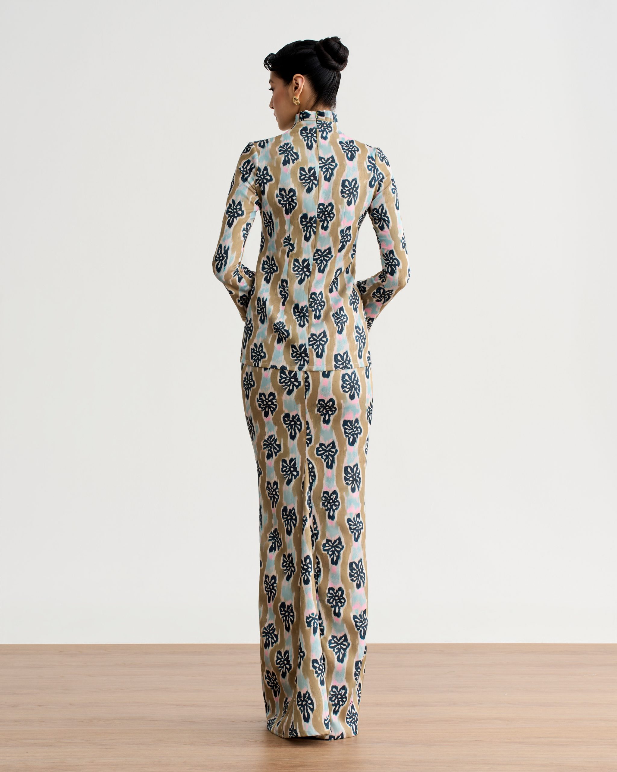 Paired with a godet-style skirt, the design flows beautifully with every movement. A concealed back zip ensures a seamless finish, while the elastic waistband offers comfort and ease for all-day wear.