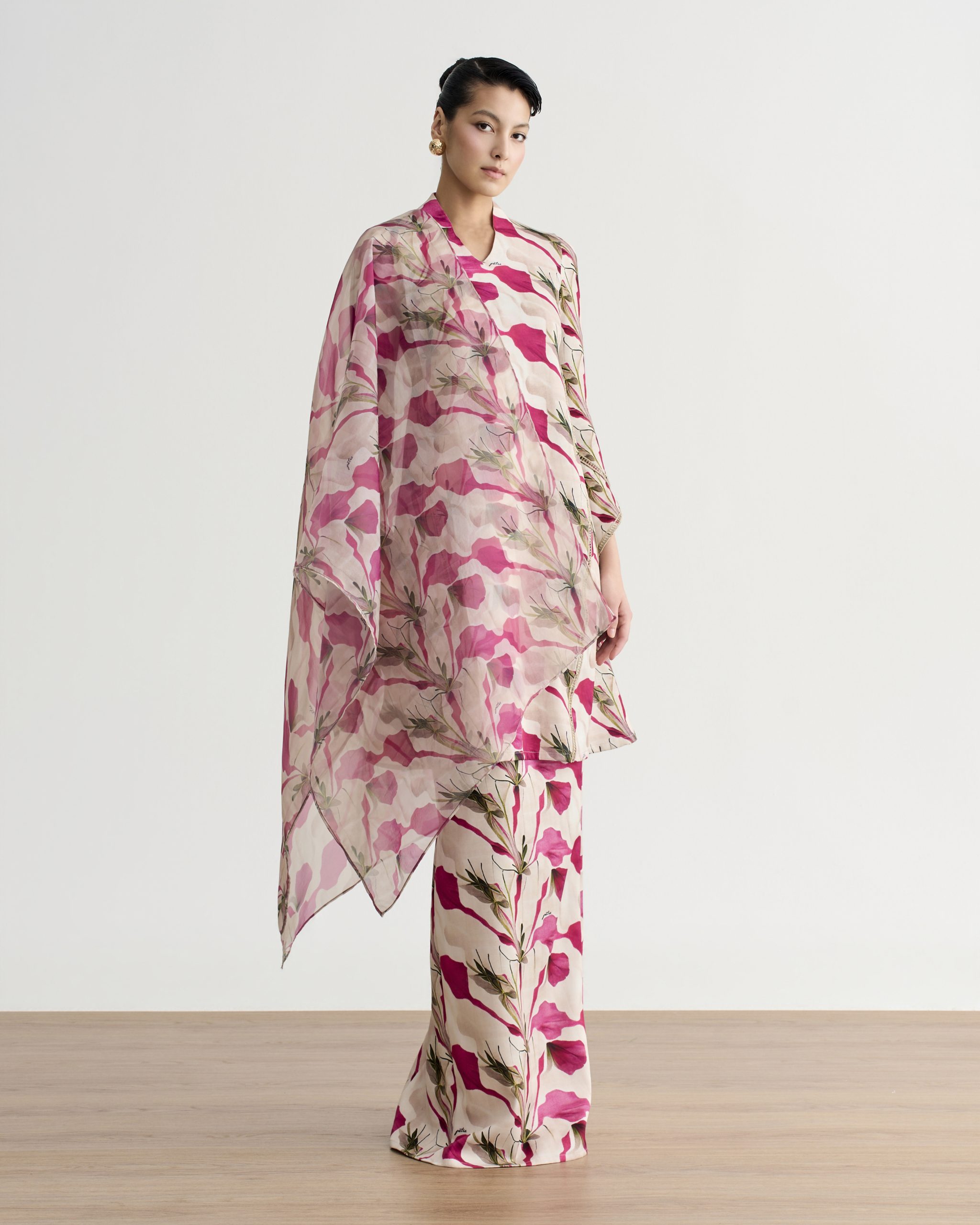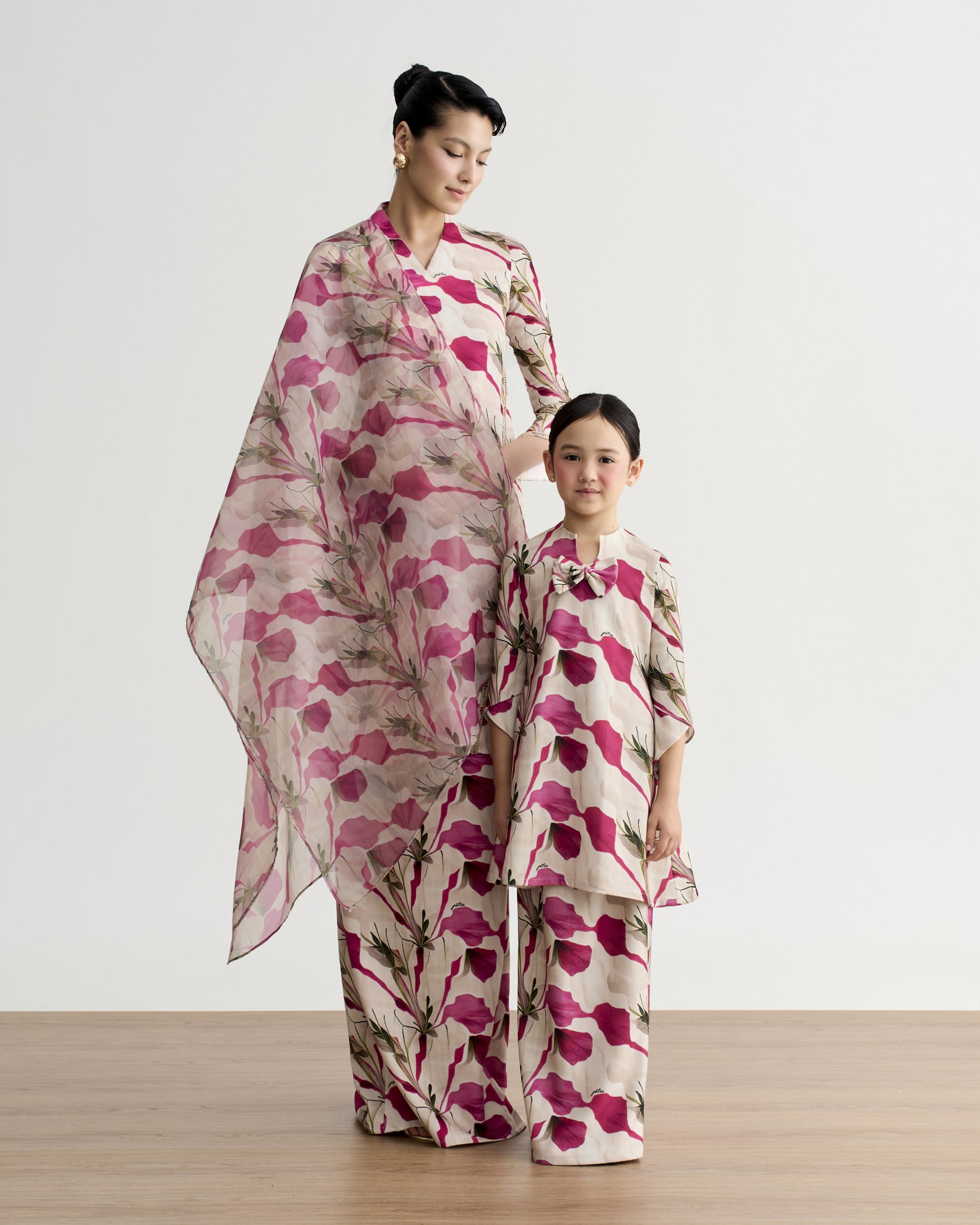The petal sleeve design is finished with gold trim, lending soft movement and feminine charm. Crafted from soft crepe spandex, the kurung offers comfort and elegant drape, while a concealed back zip and elastic waistband ensure ease of wear. Completing the look is a coordinated organza shawl, adding a light and sophisticated finishing touch.