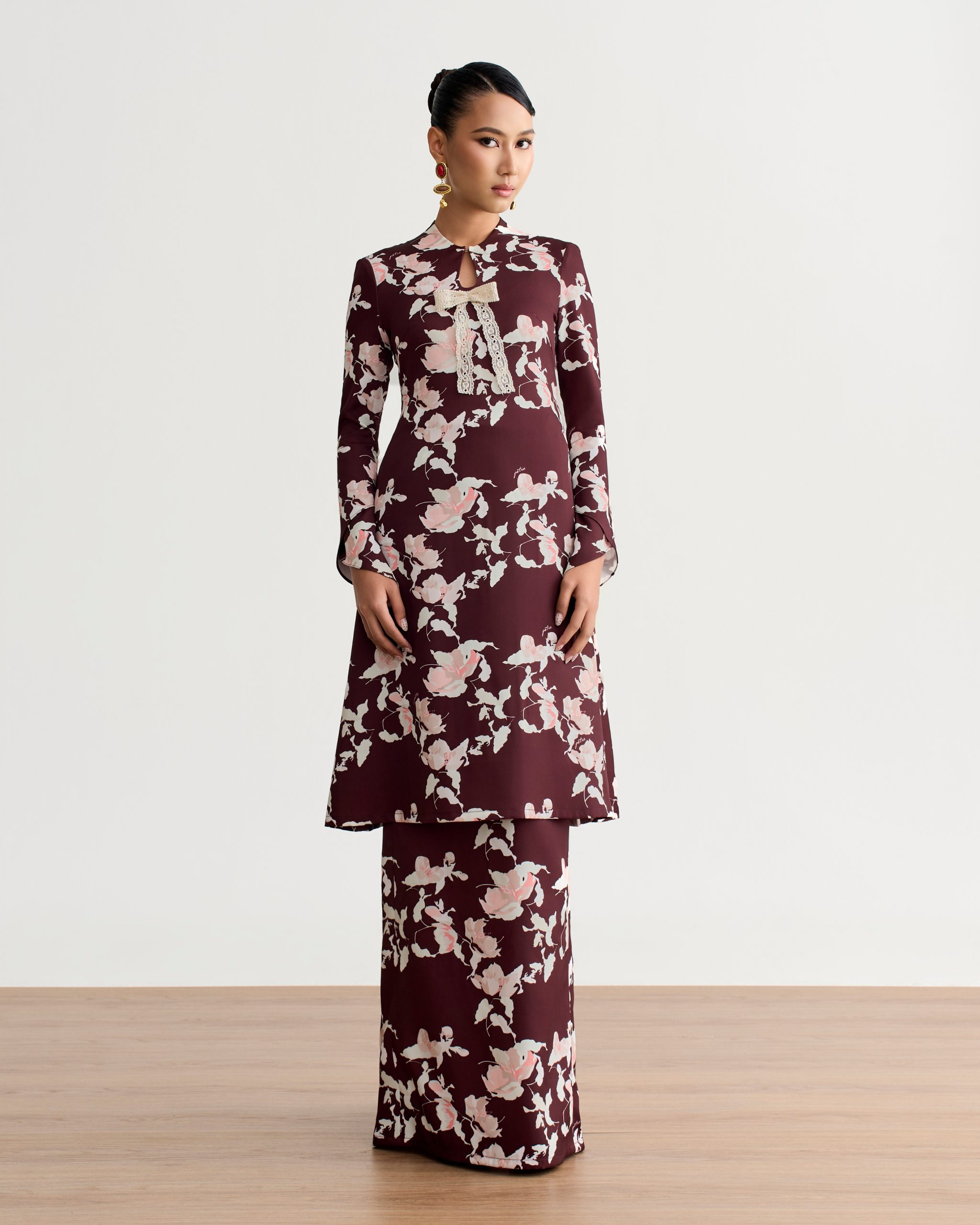 The Zehra Kurung Pahang is a refined take on a classic silhouette, designed with graceful details that enhance its timeless appeal. Featuring side box pleats, this kurung pahang offers a structured yet fluid look that flatters the form. The keyhole neckline, complemented by delicate bow detailing, adds a subtle touch of femininity.