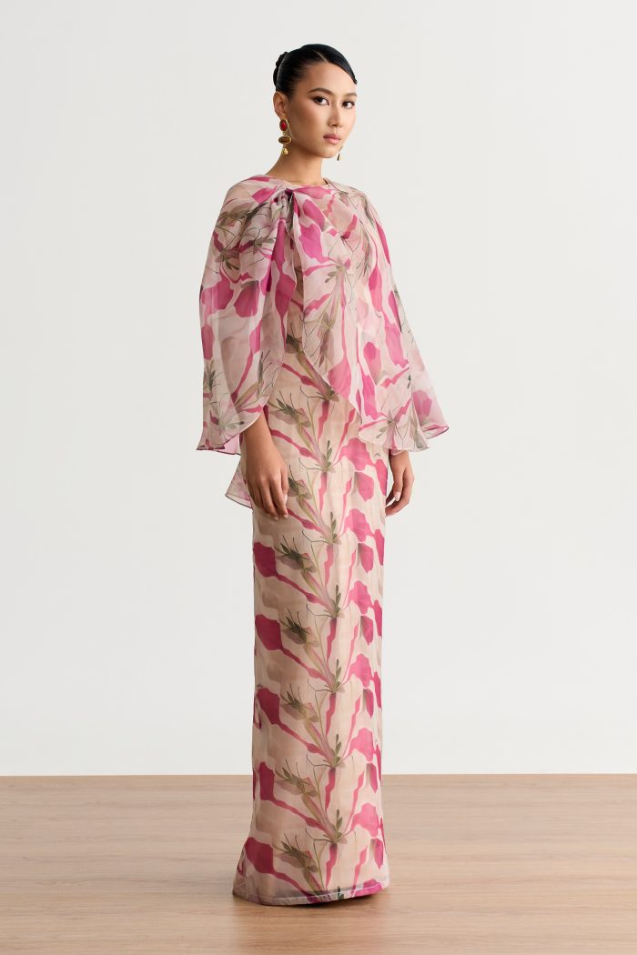 Amory is a pink and light teal satin modern kurung with twisty draped detail on the bodice. Amory is also available in kid’s size.