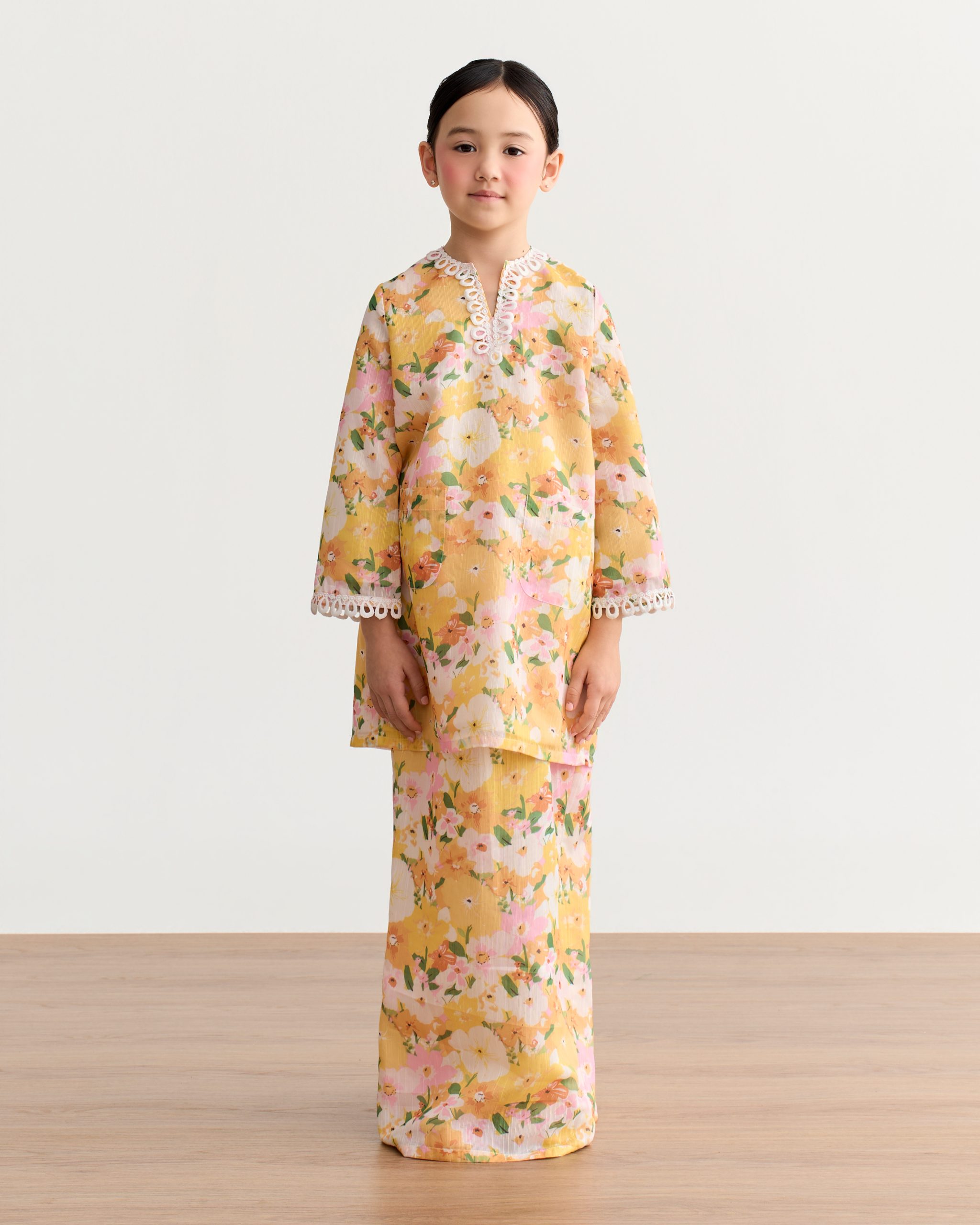 Sweet and elegant, Natasha Kids is a baju kurung designed for little fashionistas. Featuring embroidered cotton and lace details, this comfy piece is perfect for a graceful Eid look.