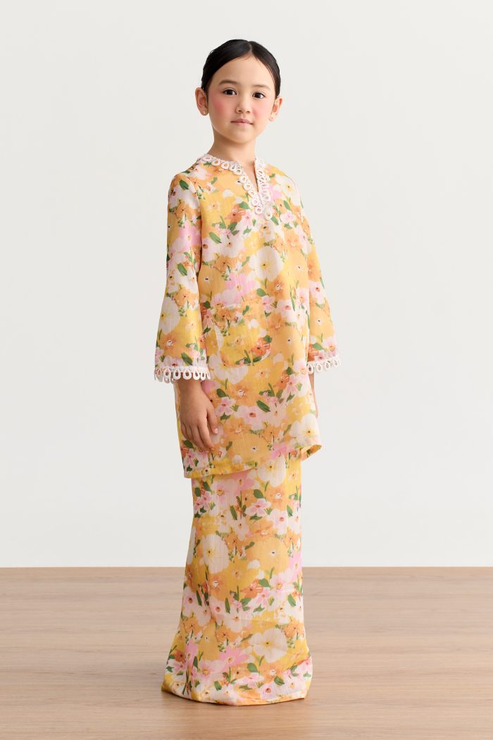 The Ophelia Kurung Pahang Kids is a charming blend of style and playful elegance. Featuring a front pocket and delicate lace detailing along the neckline and sleeves, this kurung adds a sweet, refined touch to any little one’s outfit. The godet-style skirt flows beautifully, creating graceful movement with every step. Designed with a full waistband…