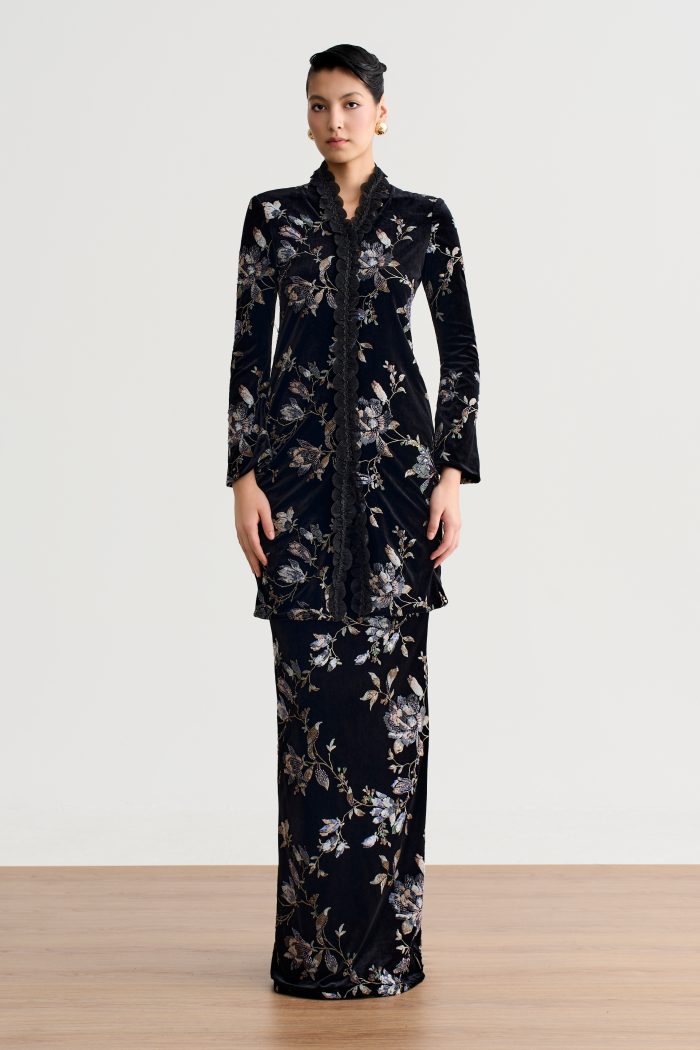 RM174.85Top: Kurung mini silhouette Rounded collar Flare sleeves with self tie waist detailing Back zipper Skirt: Soft mermaid style Half elastic waist with zipper and hook Material: Soft Poly Viscose (Non-crumple / ironless) Color: Black with orange and pink floral Caring instruction: Handwash/machine wash on cold only. Do not tumble dry as wet viscose material…